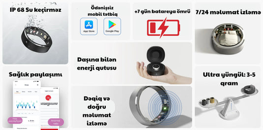 Bu şık və rahat ağıllı üzük ilə yuxu rejiminizi, fəaliyyətlərinizi izləyin və daha sağlam gündəlik vərdişlər qazanın.